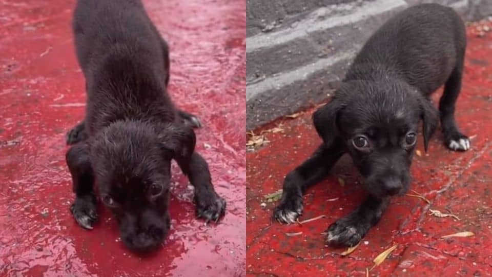 A tiny black puppy lay flat on the pavement, shaking so hard his whole body moved.