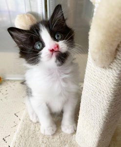 Odahviing, a black and white kitten, was found whimpering in a car engine and brought to Ashley Kelley, a fosterer of Wrenn Rescues. He was born with a reciprocal split lip and required tube feeding for the first two weeks of his life.