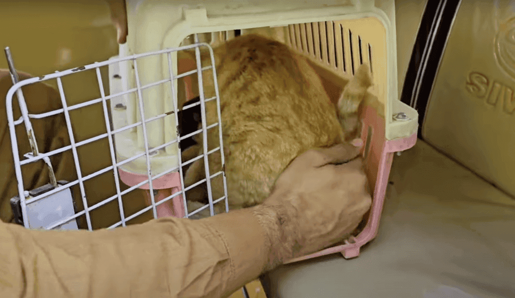 The moment he lifted the cover, the mother cat jumped inside without hesitation. There was no fear, only urgency.