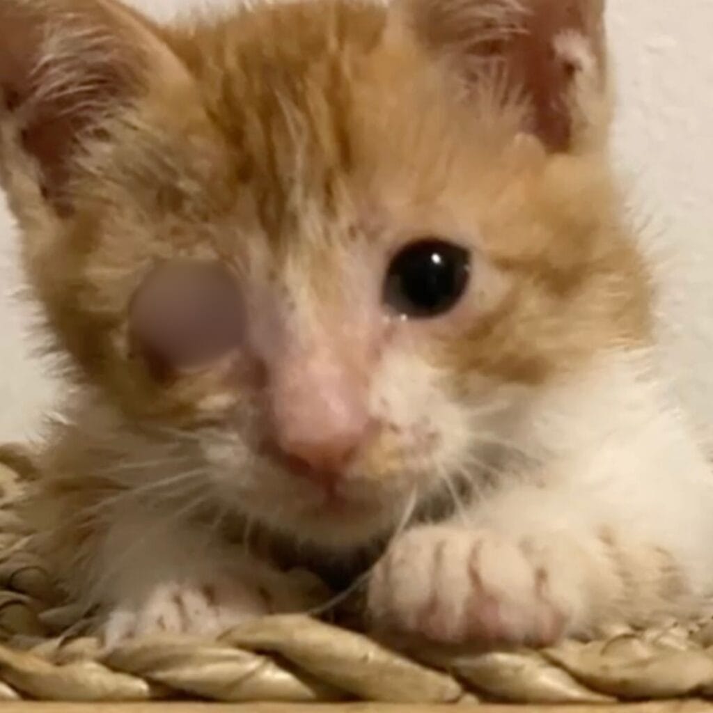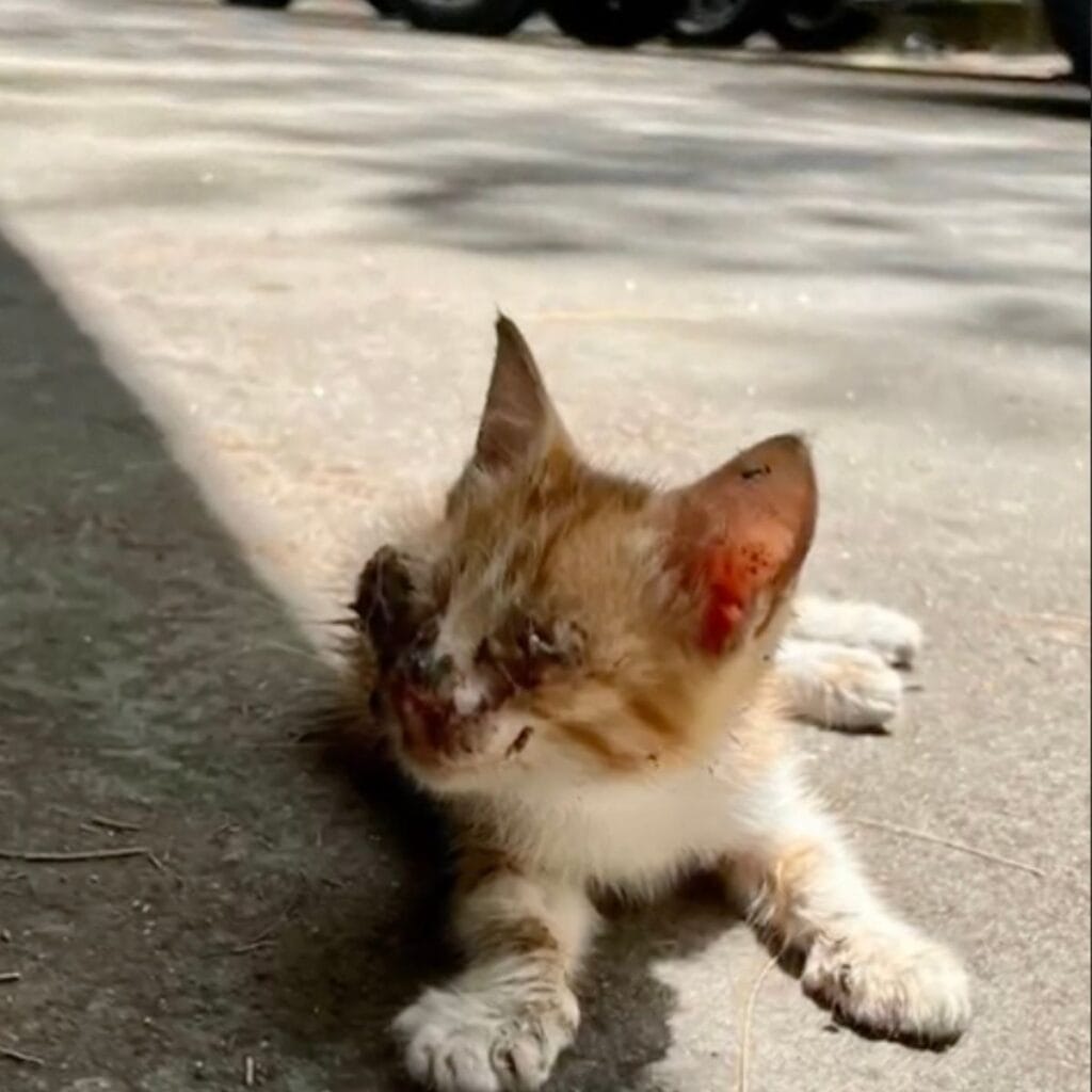 The poor little thing was barely moving. He was covered in fleas, his breathing was laboured, and one of his eyes looked seriously damaged.