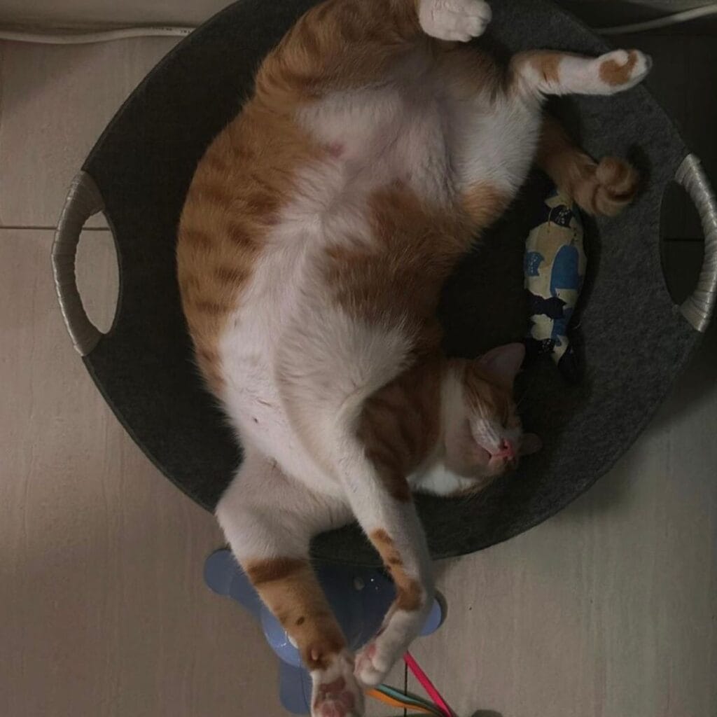 These days, Cubi is living the good life. He’s a chunky, happy cat who spends his days chasing toys, getting into playful fights with Zoe, and snoozing in the funniest positions imaginable.