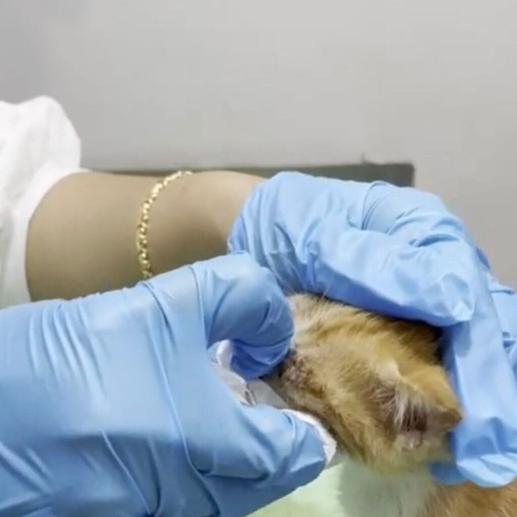 The vet worked quickly, cleaning the kitten and examining his injuries.