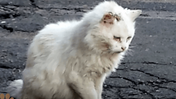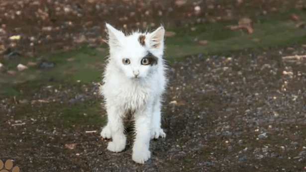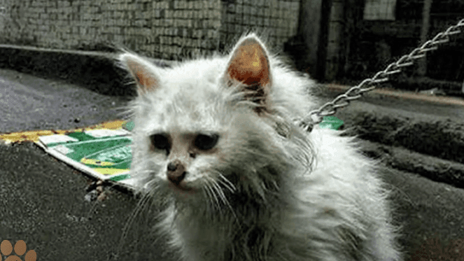 A small white cat, soaked from the rain and shaking from the cold, was tied up with a thick, heavy chain.