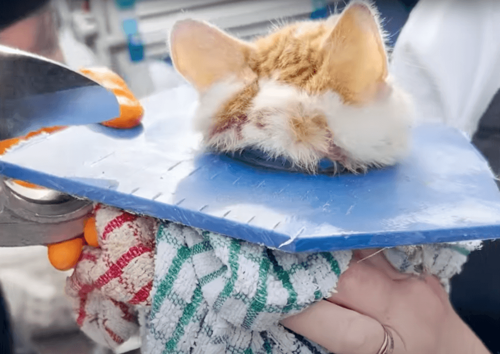 He grabbed an electric drill from his toolkit and began carefully working on the plastic around the kitten’s neck.