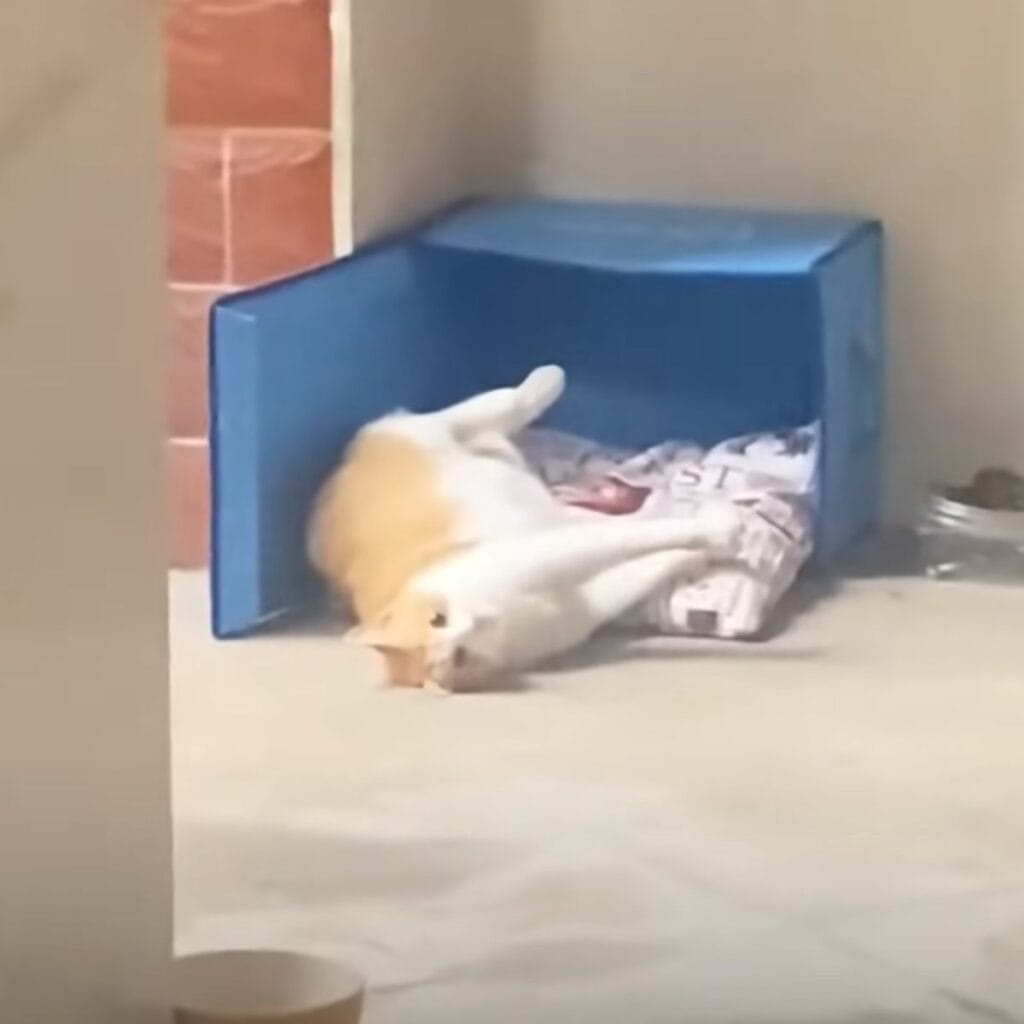 A woman spotted her lying next to a blue box, her tiny body trembling, clearly in pain.