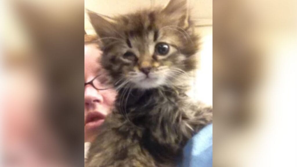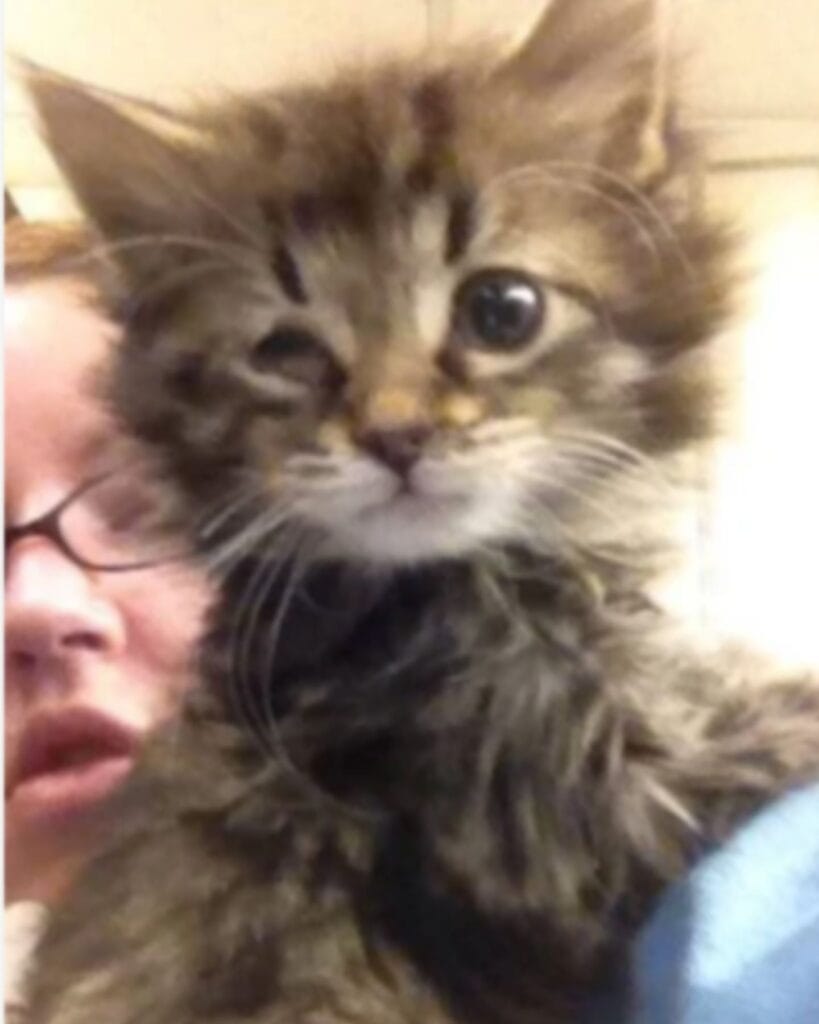 The tiny kitten was battling an upper respiratory infection, conjunctivitis, and feline pneumonia all at once.