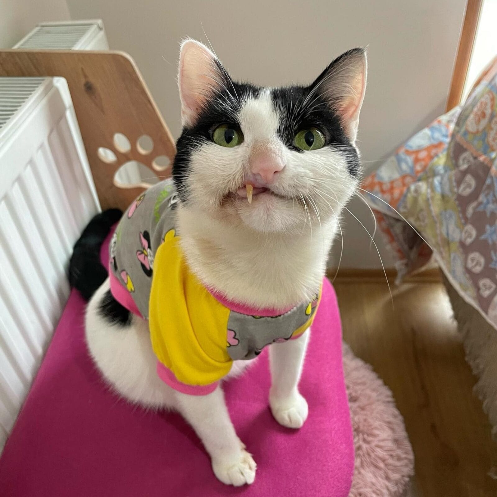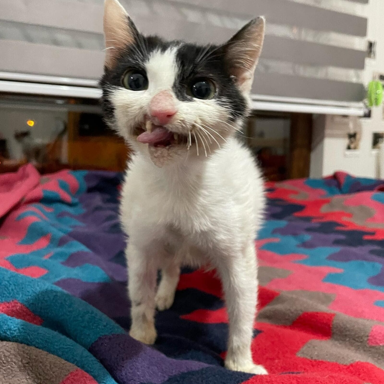 Today, Zombi is thriving. She eats with ease, plays with her feline siblings, and charms everyone she meets with her crooked but heart-melting smile.