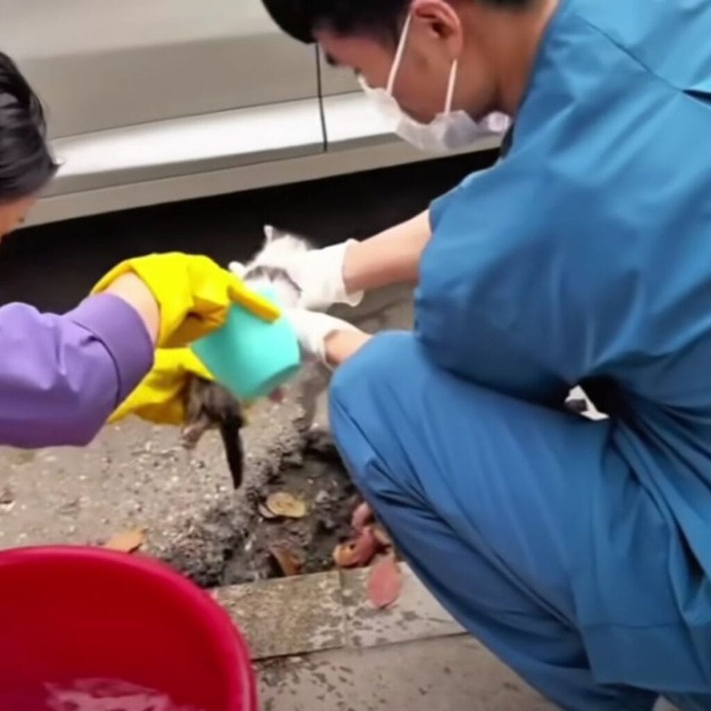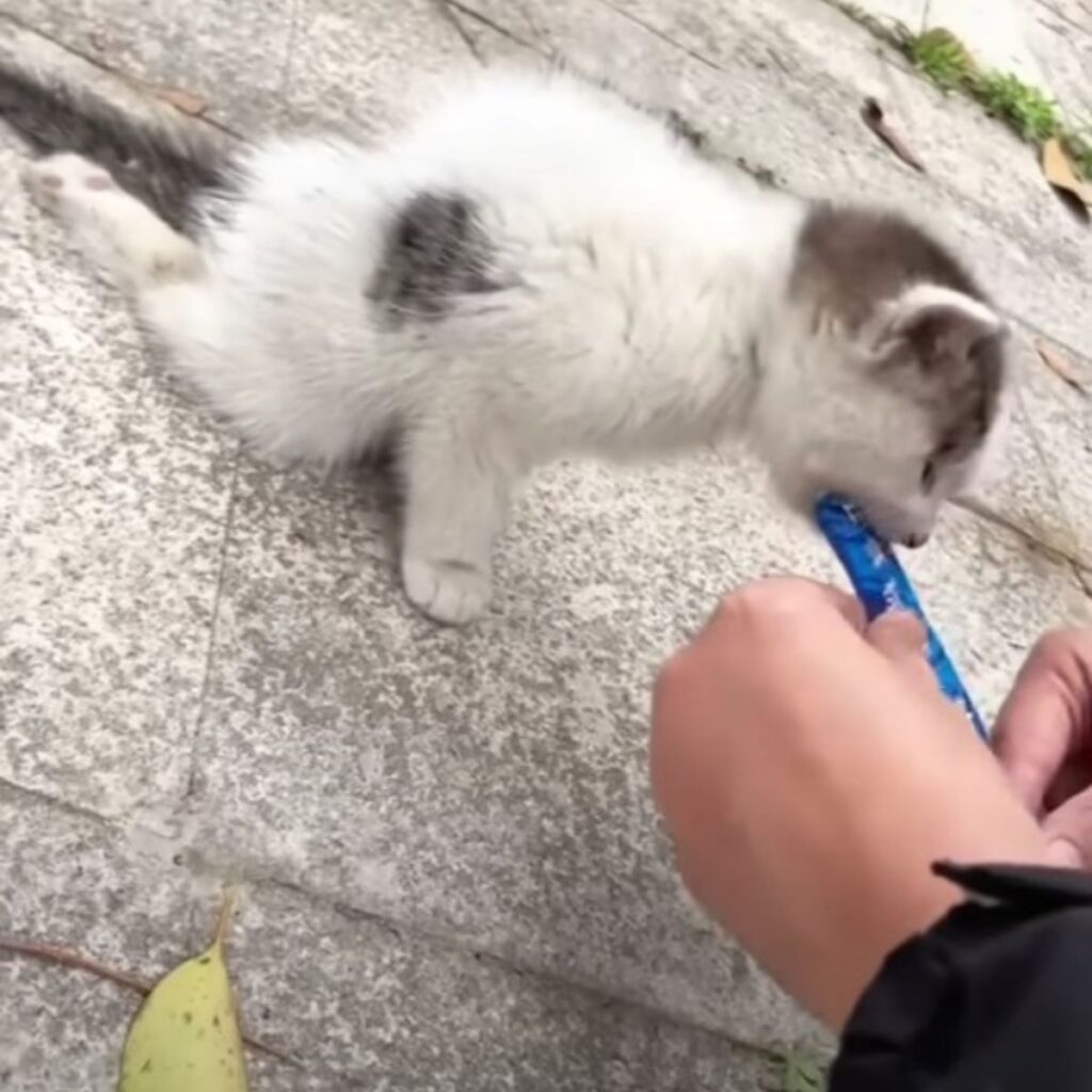 But the kitten continued to cry. Something was wrong. His belly looked swollen. Acting on instinct, the man gently massaged it.