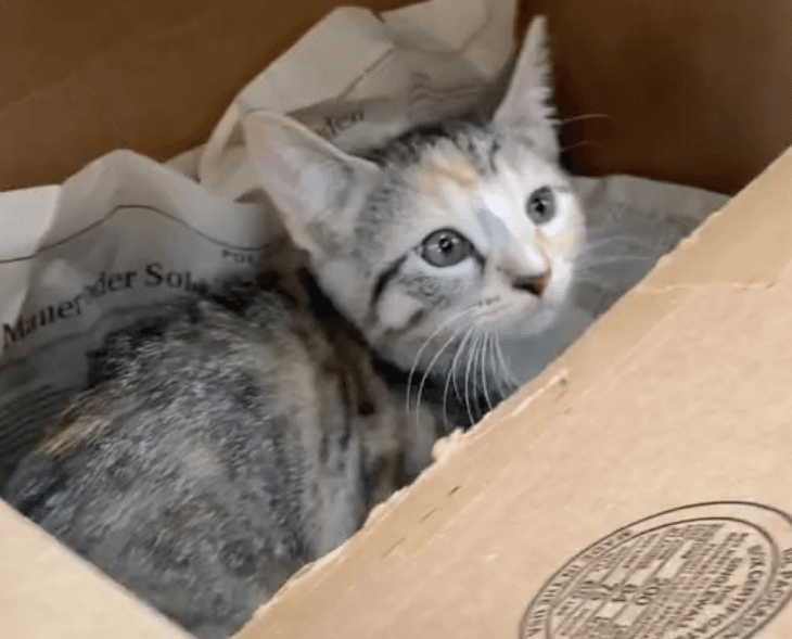 Inside, they found a tiny kitten sitting on a pile of crumpled newspapers. She was alone, with no blanket, no food, and no sign of anyone nearby.