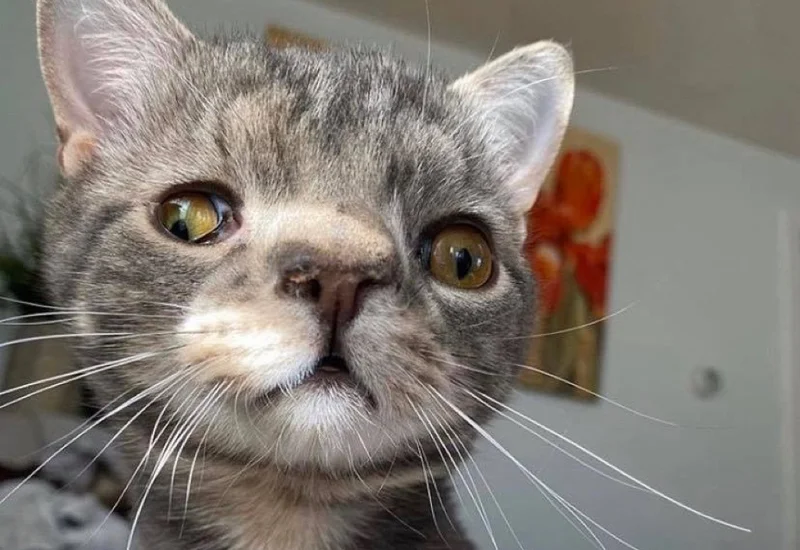 His nose is flatter than most cats, his eyes point in different directions, and he has mild hydrocephalus.