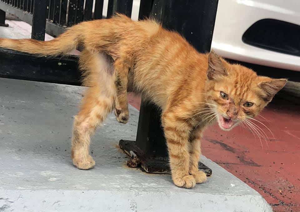 Following the sound, she found a tiny ginger cat hobbling toward her, his back right leg badly broken.