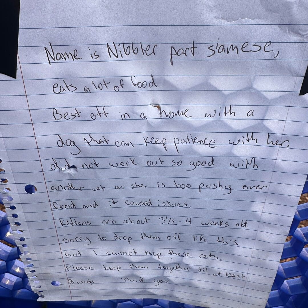 Name is Nibbler part Siamese, eats a lot of food. Best off in a home with a dog that can keep patience with her. Did not work out so good with another cat as she is too pushy over food and it caused issues. Kittens are about 3 1/2–4 weeks old. Sorry to drop them off like this, but I cannot keep these cats. Please keep them together at least.