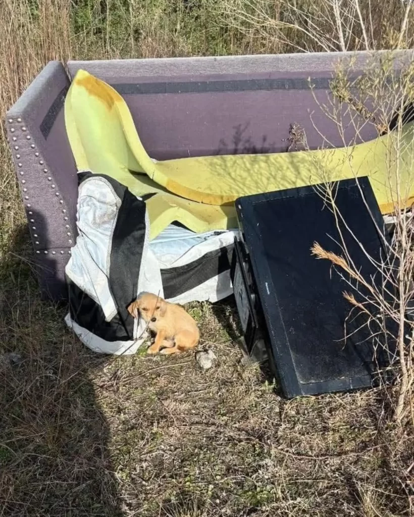 Among a scattered heap of broken furniture — an old couch, a cracked TV, and other forgotten things — something small moved.