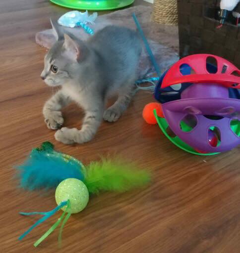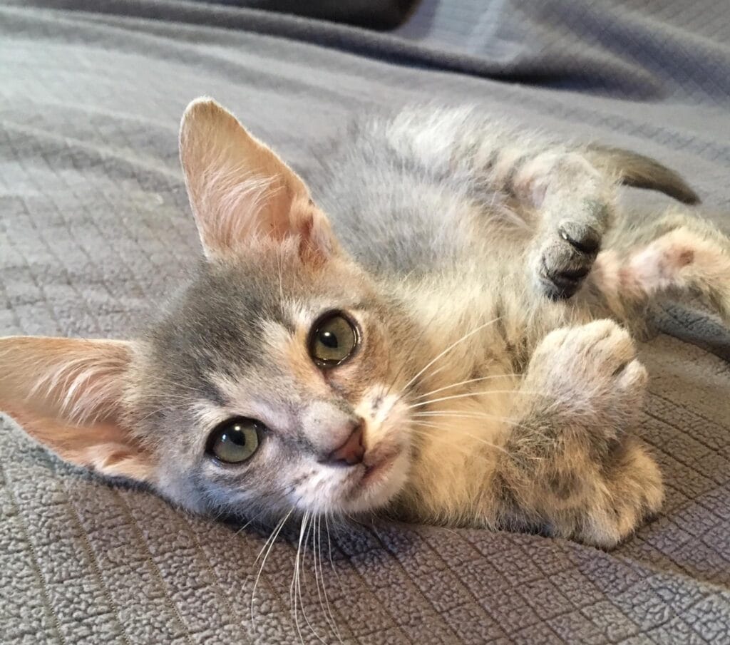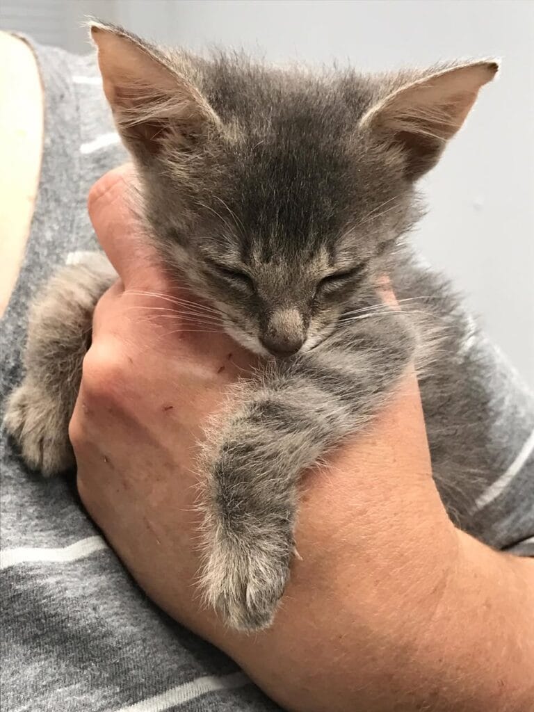 Following the sound, she discovered a tiny gray kitten wandering timidly around her yard.