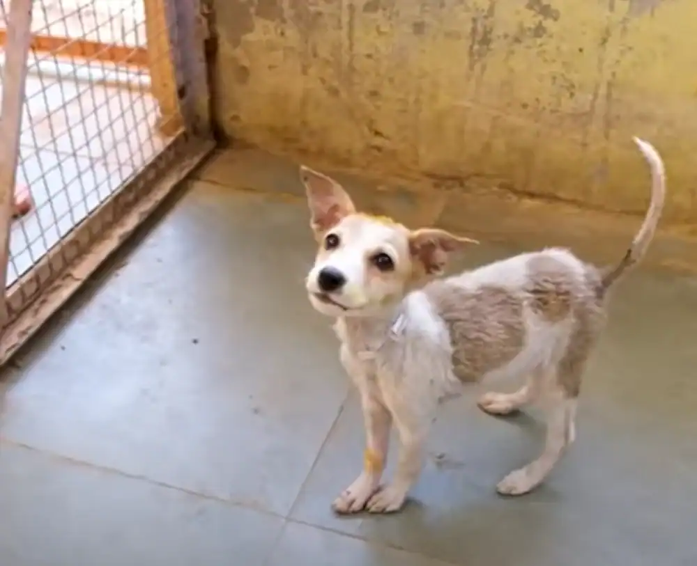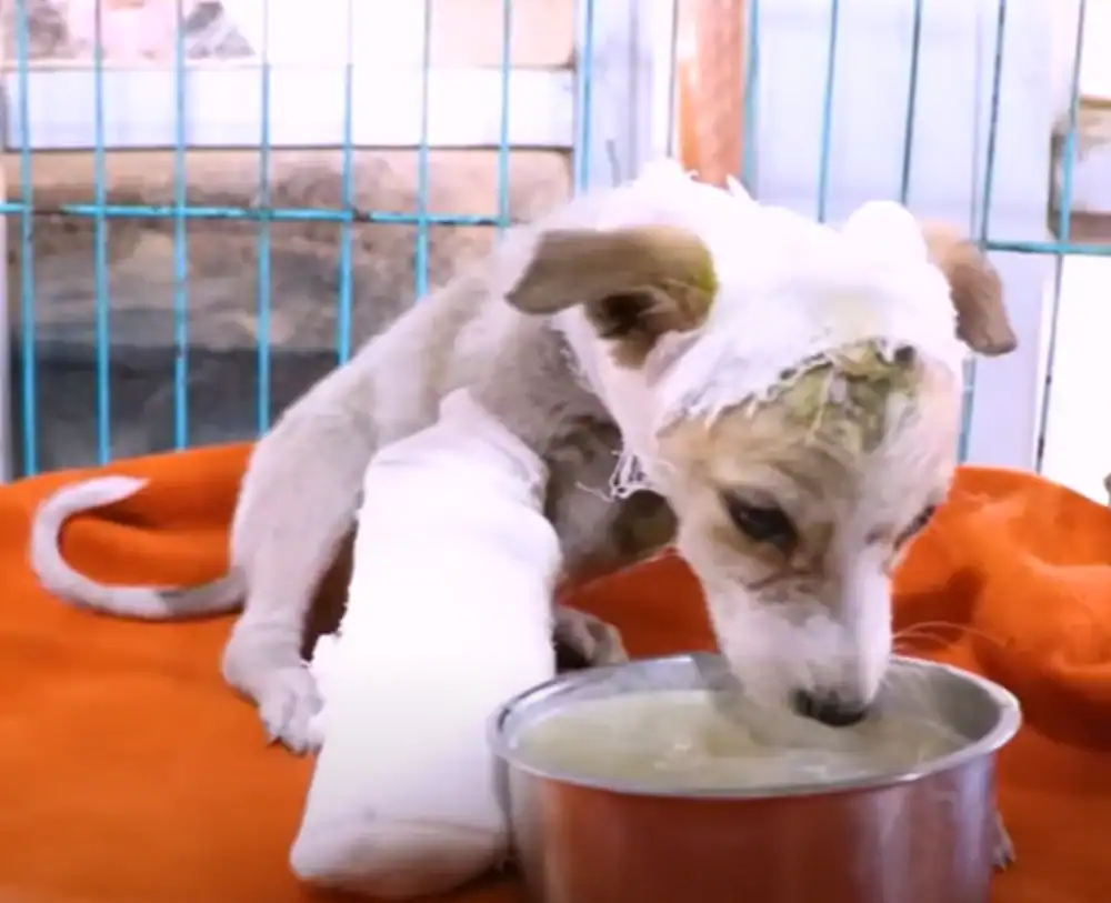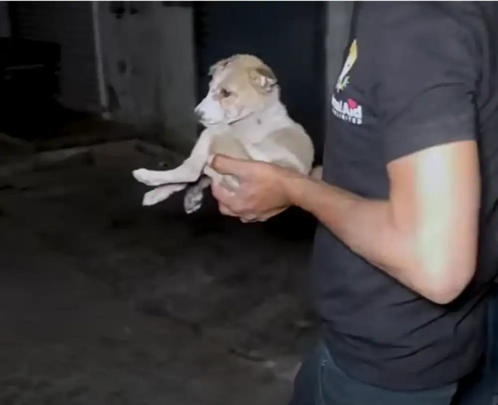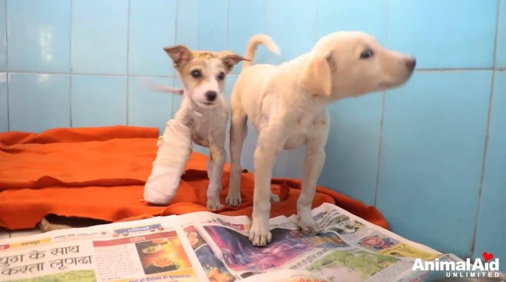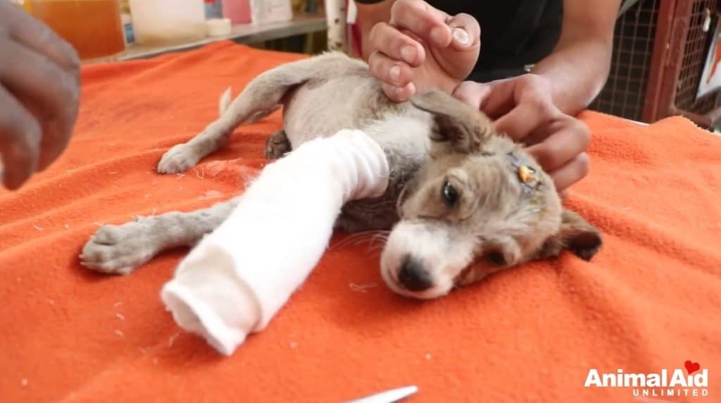 At the Animal Aid Unlimited center, the puppy was placed on a clean surface where light replaced dust.