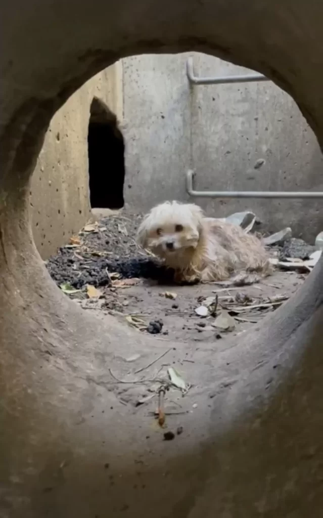 He was hidden in a storm drain, his body curled up tightly as if he were trying to disappear. The poor dog made no sound, didn’t bark, didn’t move.