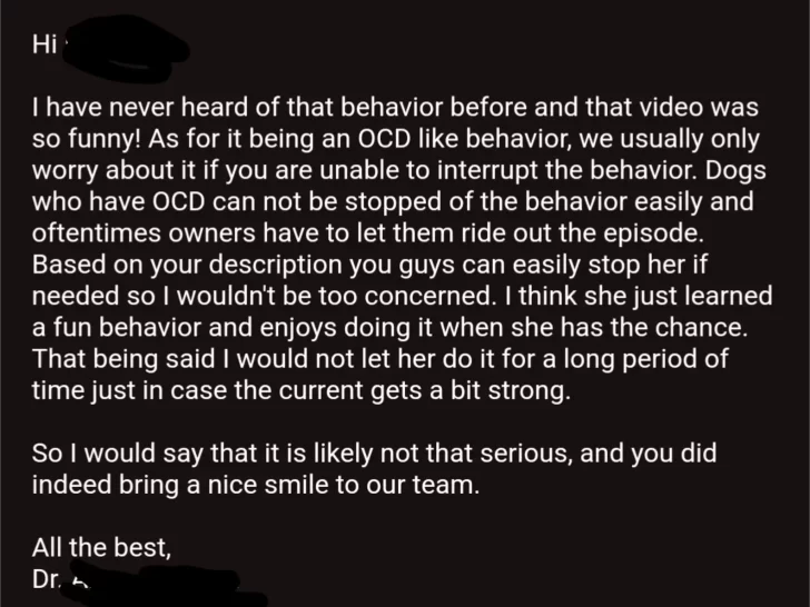 Just to be sure that Katie’s love of wielding electricity wasn’t problematic or indicative of some unhealthy compulsion, Michelle told her vet about what she’d been up to and shared a video of Katie’s zaps.