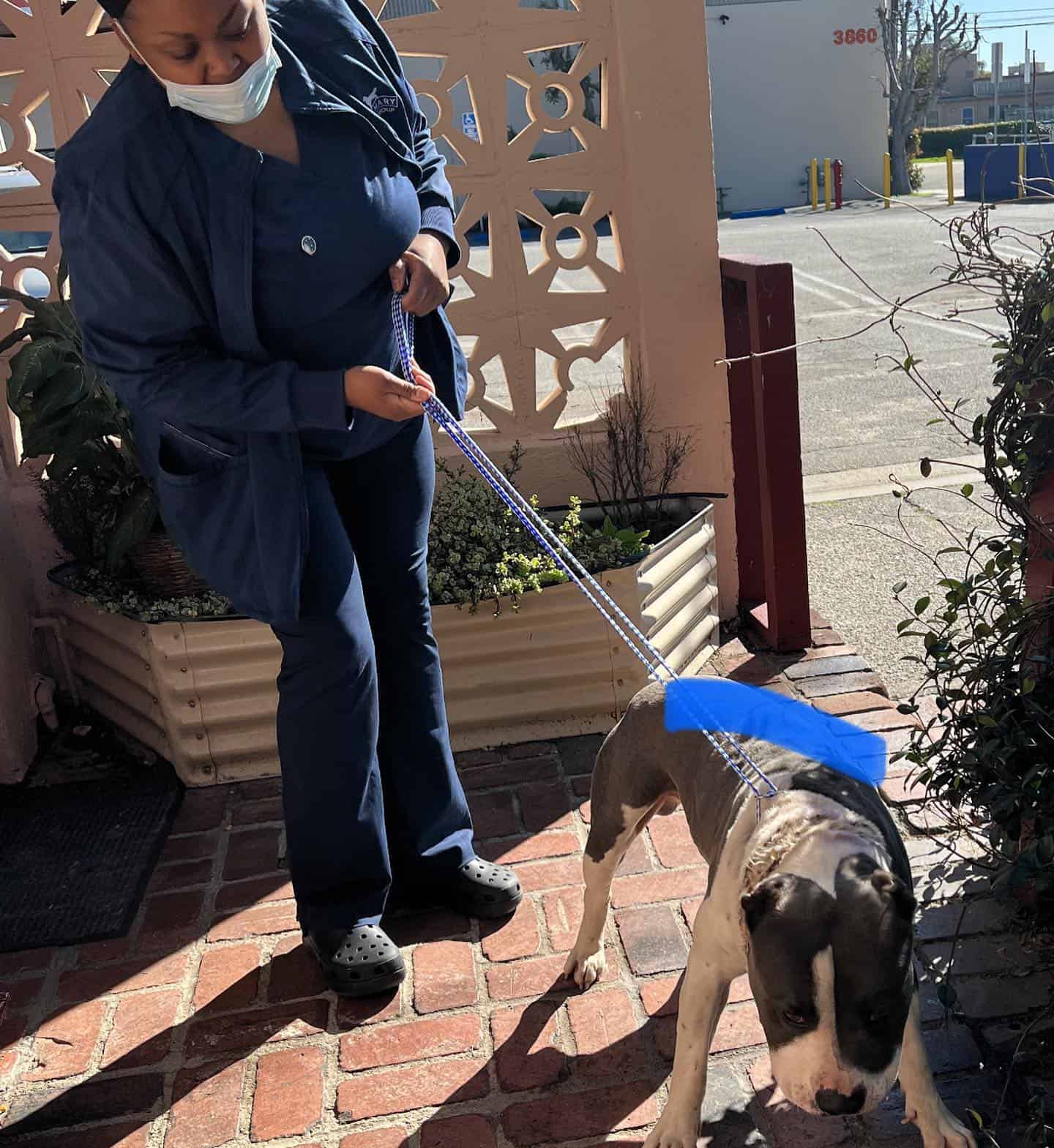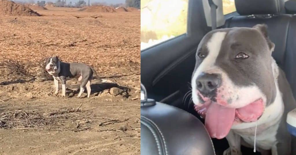 In Bakersfield, California, a volunteer with R.A.D. Rescue was driving along a quiet road when she noticed a pit bull digging through trash. His face looked unusually puffy — almost cute in a way — but something about it felt off. She pulled over for a closer look and her heart sank.