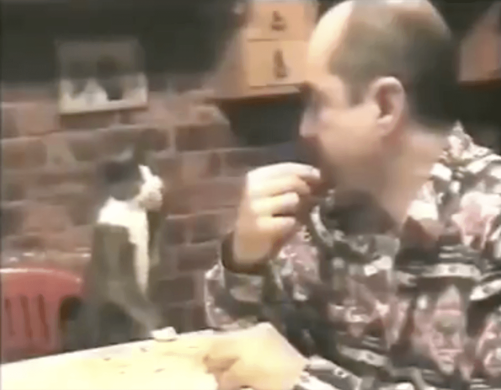 The footage shows the man peacefully eating dinner in the kitchen. Out of the blue, his cat gently taps him and brings its paw to its mouth, mimicking the universal gesture for “feed me.”
