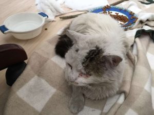 Once they finally had him safely in their care, the couple gave the cat a nice meal and then rushed him to the vet. They decided to name him Yoda, and hoped with all their might that the vet would be able to help him.