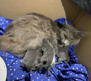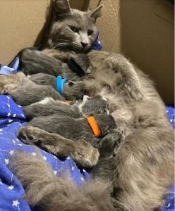 Aurora, the mother cat, was famished and attempting to feed six hungry mouths with no food sources. She spent all of her time in a changing house with her kittens, feeding them and making sure they were all alive.