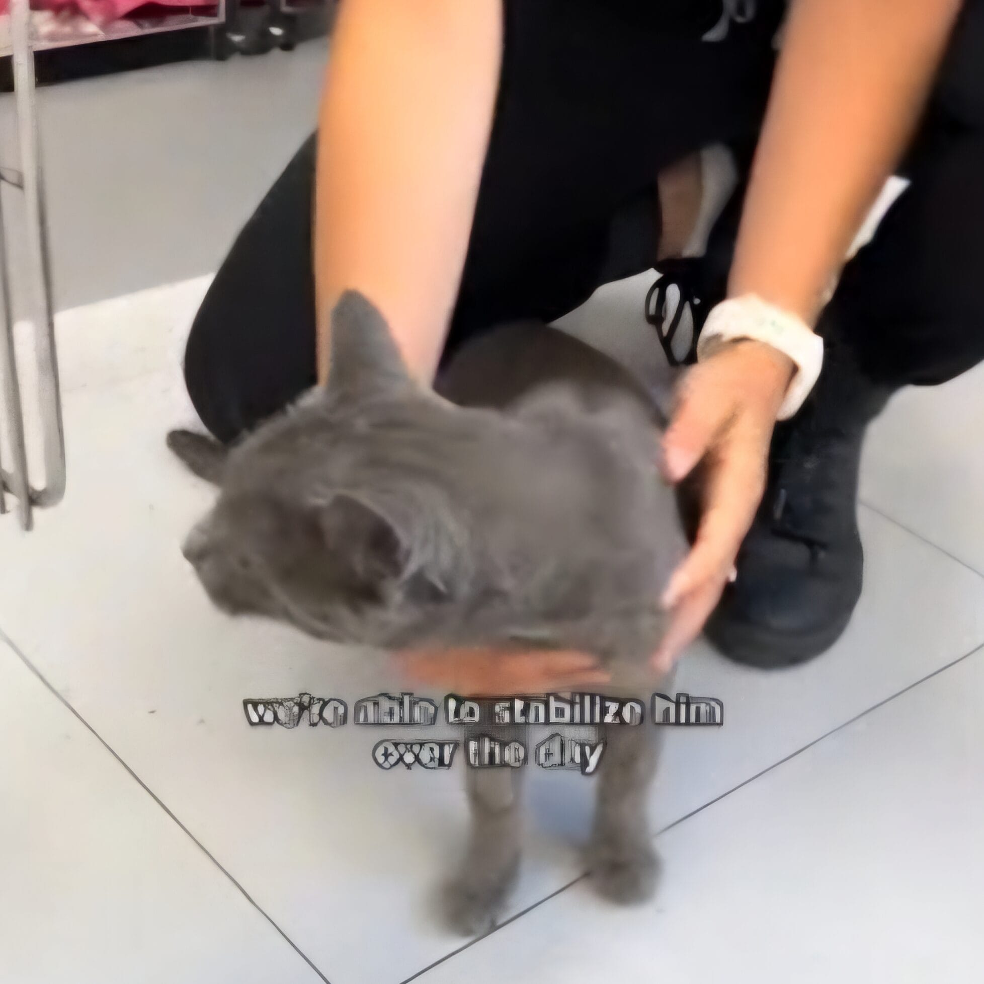 The cat, a beautiful gray boy, was stabilized and kept at the clinic over the weekend.