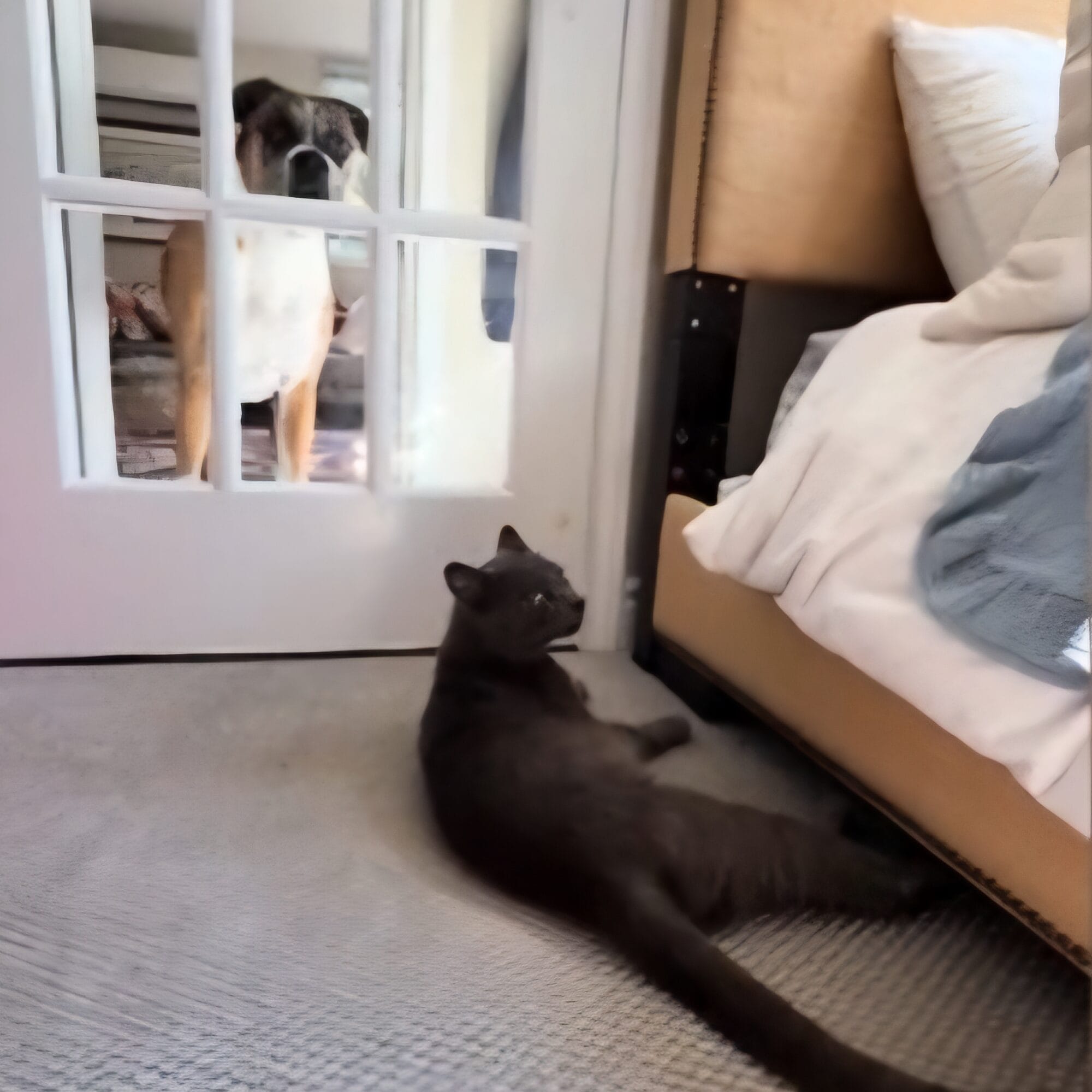 He is napping peacefully on the bed, and even meeting Fiona’s dog, Link, through a glass door.