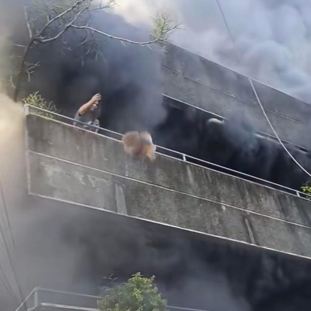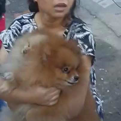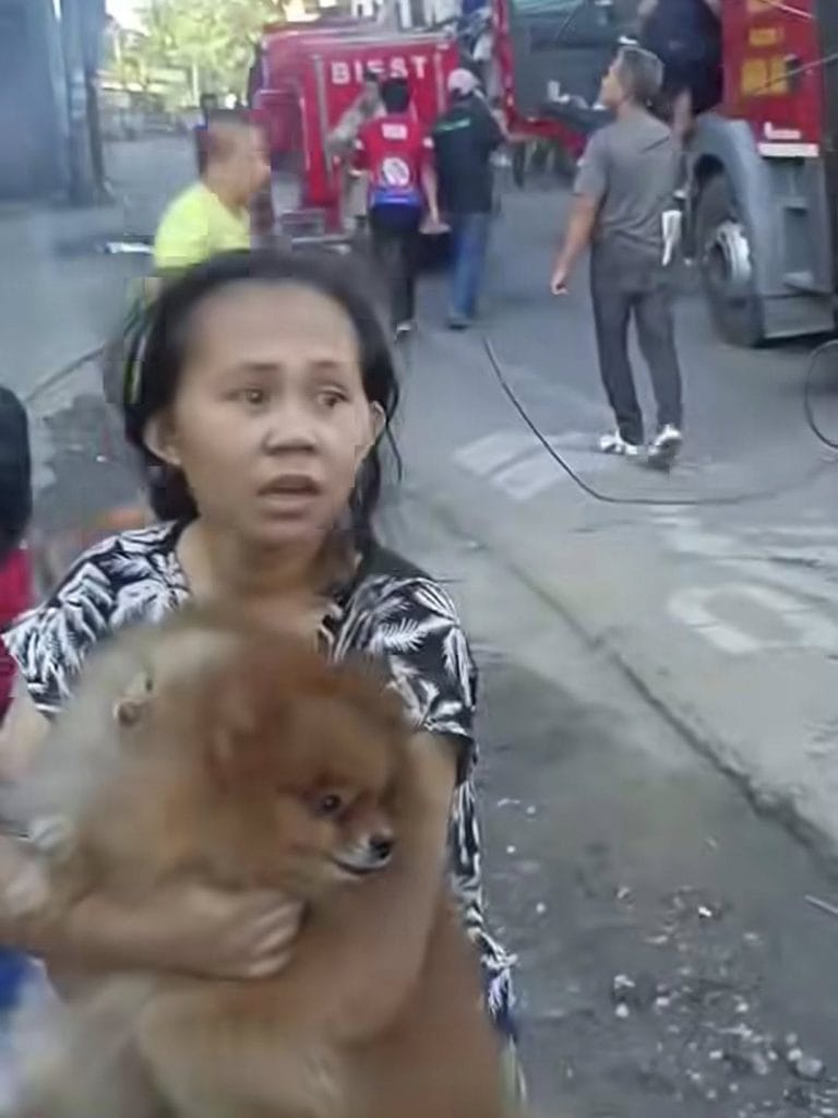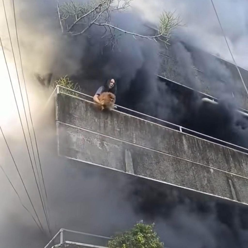 Amid the panic, a woman stepped onto her second-floor balcony with her two terrified dogs pressed against her chest.