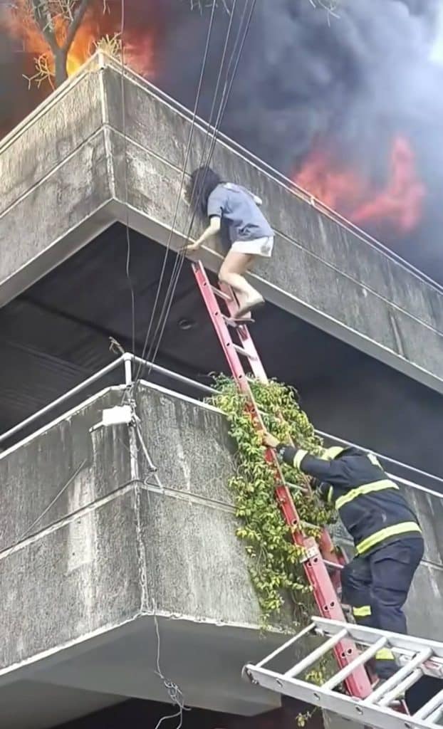 The ladder shook slightly, but the firefighter kept his hand raised beneath her as support.