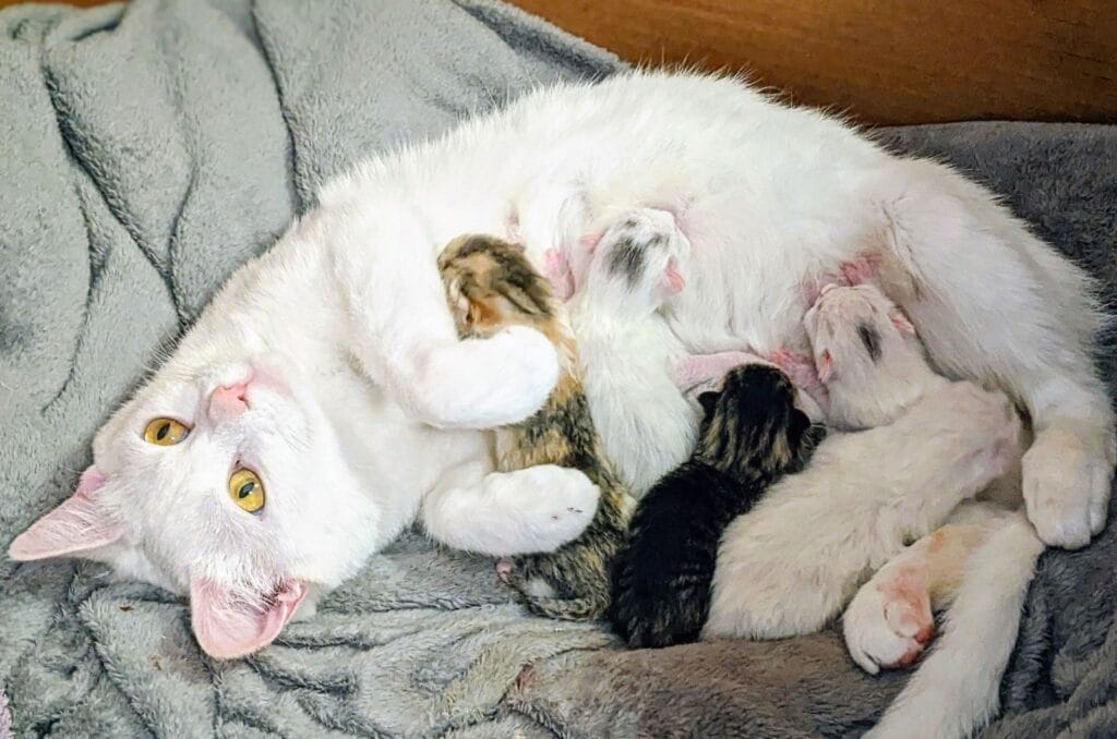She has food, comfort, and a place where her kittens can grow strong and healthy.