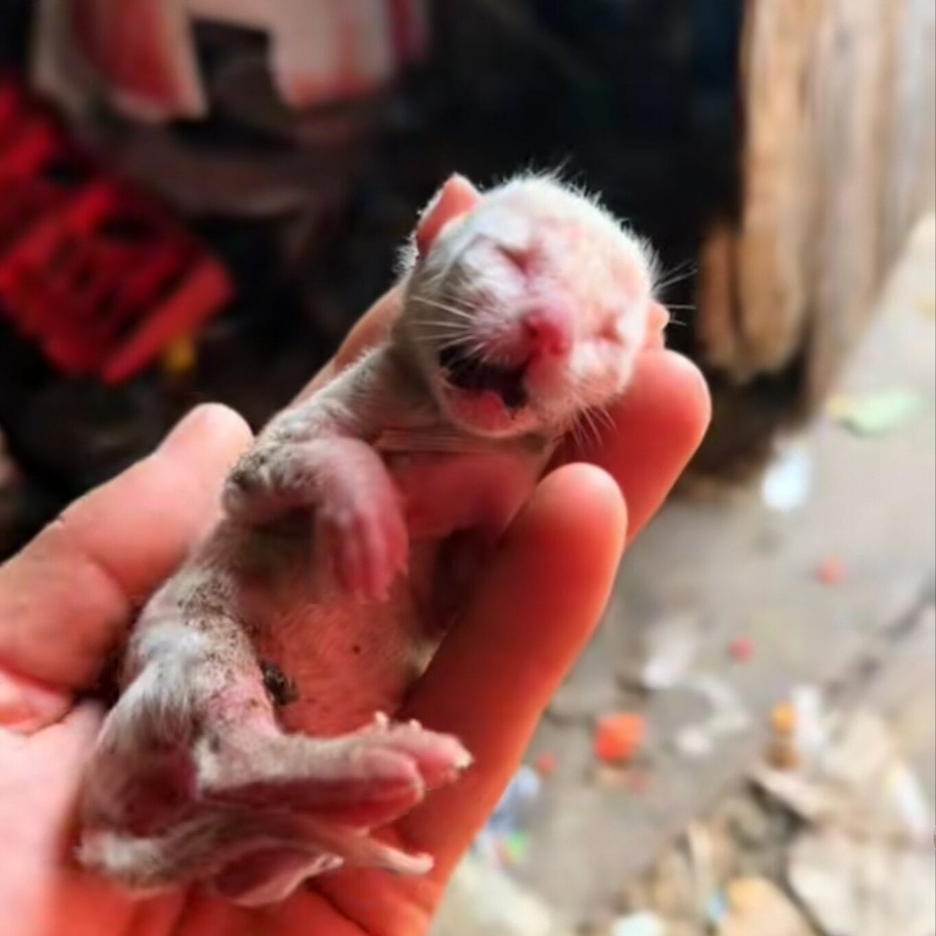 His meows were so desperate that his little mouth was dirty from the effort. It was heartbreaking but also a sign of strength.