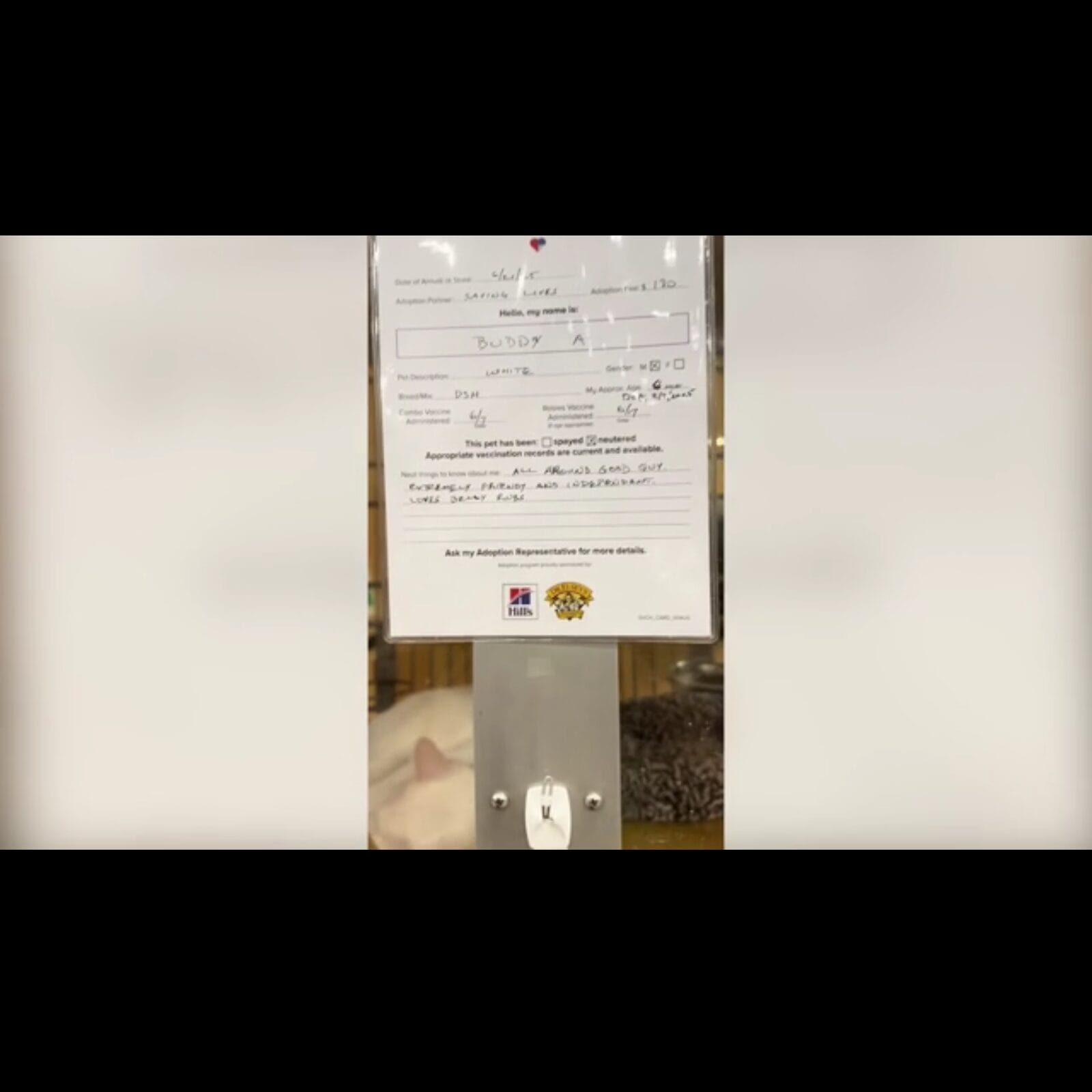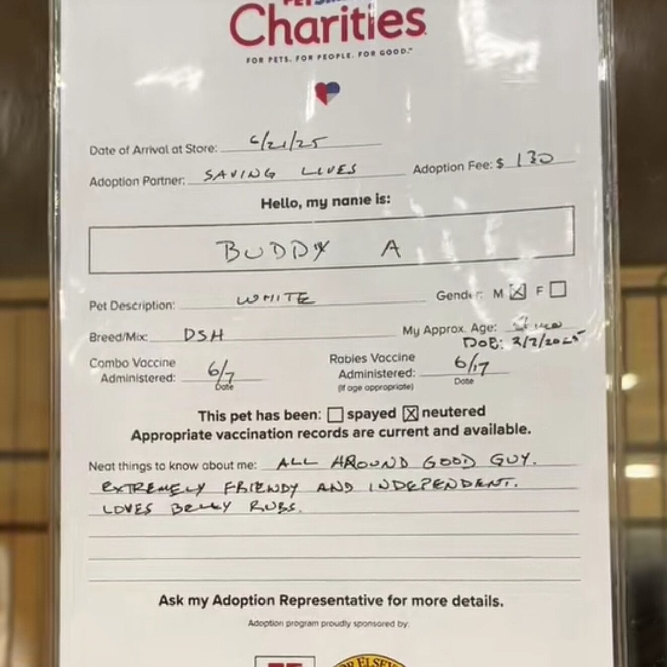 Buddy’s information card said that he had been brought to the store back in June, was neutered, vaccinated, and only a few months old.