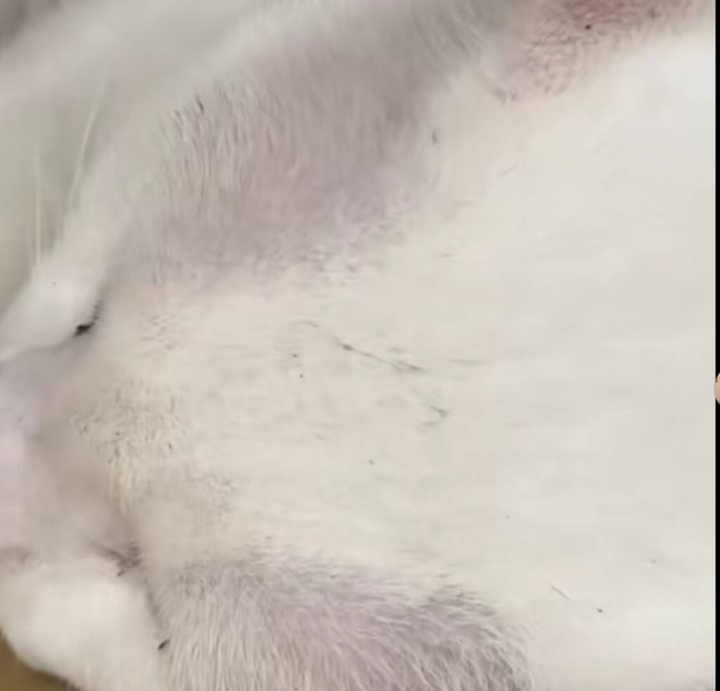 In the short clip, Buddy can be seen resting quietly while tiny fleas crawl over his fur.